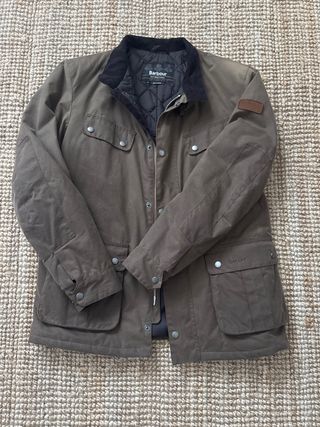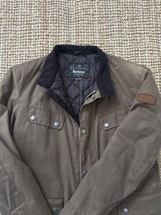 Cazadora Barbour en talla L, color marrón. Se encuentra en perfecto estado. - Cierre de cremallera y botones a presión. - Cuello de pana. - Bolsillos frontales con solapa. - Parche de cuero en la manga.