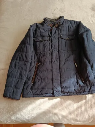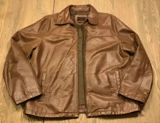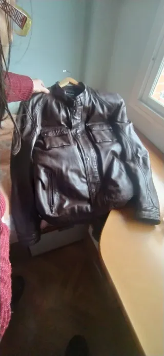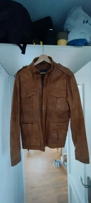 Cazadora de cuero marrón claro, de napa muy fina, es de entretiempo, la talla es XL pero talla como una L. Me la he puesto literalmente dos veces.