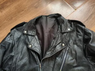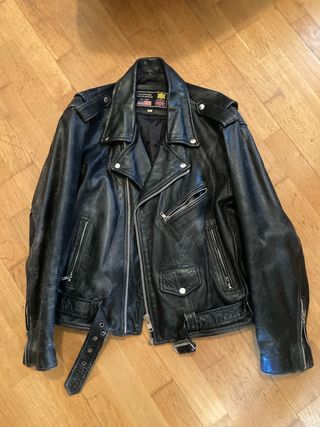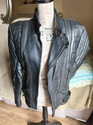 Chaqueta cazadora perfecto ingles, tipo biker, con diseño clásico rockero de piel. Talla 52, como L. Mide 56 cm de axila a axila, 59 de manga, 55 de hombro a hombro y 66 de largo total por mitad de la espalda sin contar el cuello. Tiene algunos desperfectos, pero al ser tan antigua es normal, se puede ver en las 2 ultimas fotos. Mucha más ropa de firma, de cuero y de moto en mi perfil.