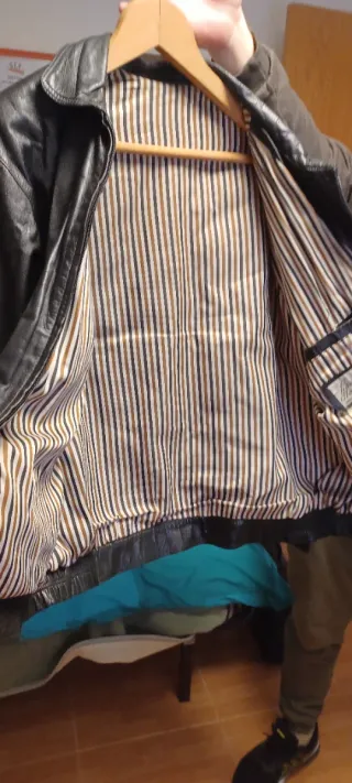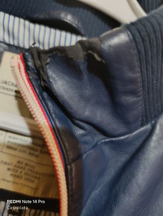 Cazadora Jack & Jones XL R33. Grado C. XL; 56 axila x 69 largo. Evidentes signos de desgaste como puede verse en la fotos. Cuero sintetico con bolsillos exteriores de cremallera y bolsillo interior. Forro de raso a rayas. Los grados del textil son A, B y C, independientemente del grado que indiquemos en el estado de Wallapop. Siendo A; Muy bueno, B; Bueno, C; Aceptable. Cualquier defecto se hará constar. El textil se fotografía y empaqueta para se enviado por lo que puede llegar arrugado y necesitar ser lavado. Revisa bien las medidas antes de comprar.