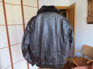 Cazadora de cuero estilo aviador en tono marrón oscuro, con cuello y chaleco interior desmontables de pelo sintetico, cintura y puñosde punto, medida entre axilas 69 cm. ancho espalda 59 cm. y largo de manga 64 cm. en buen estado.