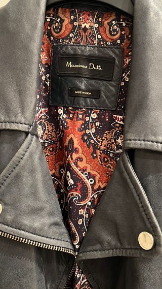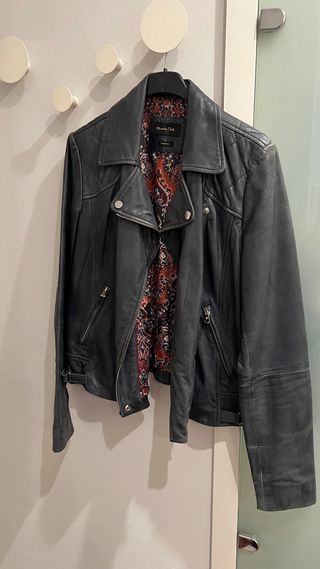 Cazadora de cuero con un diseño moderno y elegante. Su forro interior presenta un estampado llamativo. - Cierre de cremallera. - Bolsillos frontales con cremallera. - Puños ajustables. - Detalle de pespuntes en hombros y mangas.