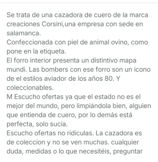 Cazadora de cuero 100% auténtico en perfecto estado. Pieza sin marca, lo que garantiza su originalidad y calidad al no ser de producción masiva. Talla S, pero equivale a M. Corte recto y amplio, cómodo y favorecedor. Medidas: hombros 54 cm | mangas 80 cm | pecho 52 cm (delante y detrás) | largo 58 cm | ancho de manga 24 cm. El cuero está impecable, sin roces ni marcas de uso. Forro interior con estampado único. La vendo por falta de uso.