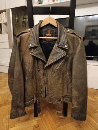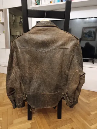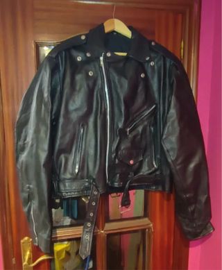 Cazadora de autentica piel de vaca. La cazadora se encuentra en muy buen estado. Le funcionan todas las cremalleras que son de la marca YKK. El forro esta bien ,sin ningún tipo de roturas. La vendo porque la he comprado y para mi gusto me queda corta ,un pelín por encima de la cintura ,mido 1,92 pongo las medidas en las fotos. No se la marca real de la chaqueta, pero schott no es.