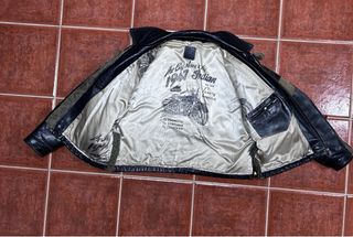 Cazadora de cuero con un llamativo forro interior estampado. - Diseño clásico de cuero. - Cremalleras y hebillas metálicas. - Forro interior con diseño de estrellas y rayas.