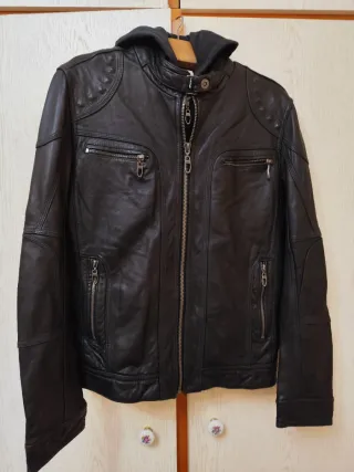 Cazadora de cuero de la marca Angelo Litrico. Nueva Tiene capucha que se puede quitar. - Bolsillos frontal con cremallera. - Cremallera principal plateada. Bolsillos en el interior