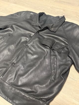 Cazadora de piel auténtica en color negro, original de los años 90. Diseño clásico con estética noventera y corte recto tipo biker, apta para uso unisex. Se encuentra en muy buen estado de conservación. Presenta pequeñas marcas superficiales propias del uso y del paso del tiempo, habituales en prendas de cuero real, sin afectar a su estructura ni funcionalidad. Es una chaqueta de piel verdadera, con buena caída y calidad, no es material sintético. Talla aproximada L, no dispone de etiqueta, verificar con las medidas: • Largo: 63 cm • Ancho de axilas: 65 cm Envío rápido y bien protegido.