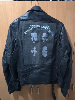 Cazadora de cuero auténtico antigua de los 80/90 con parche en la espalda de Metallica, marcas de tachuelas en las solapas, tal cual en fotos, talla 44.
