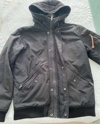 Cazadora de cuero para hombre. Muy poco uso. Capucha desmontable con cremallera. - Material: Cuero auténtico. - Diseño acolchado. - Detalle de pelo en capucha.