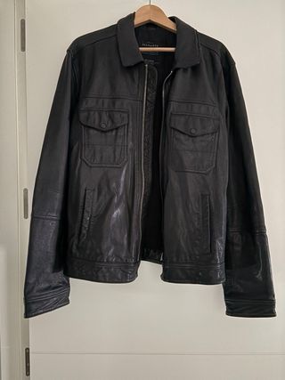 Cazadora de cuero con un diseño moderno y versátil. - Cierre de cremallera frontal. - Bolsillo con cremallera en el pecho. - Puños y cuello con detalles. - Diseño acolchado en los hombros. Cuero /polipiel. Apenas con uso