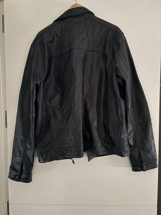 Cazadora de cuero negro hombre talla 54, tiene alguna rozadura, la q se nota más está en el lado derecho cerca del bolsillo, se ve en una de las fotos, comprada en una tienda q se dedicaban solo a artículos en piel