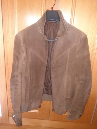Cazadora de cuero, hecha a mano, efecto ante o piel vuelta, cuello y cintura con elástico, manga larga, corchetes en puños, interior forrado,con bolsillo interior a cada lado, cierre de cremallera y bolsillos laterales. El doblez interior del cuello y mangas algo deteriorado, como se ve en la imagen.