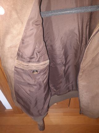 Vendo cazadora de la marca Koröshi, talla L (grande), color marrón tipo “efecto piel”. · Material: efecto piel (cuero sintético) + forro interior. · Estado: usada, en buen estado general, pero con marcas y zonas de desgaste en algunas partes (ver fotos). · Detalles: cierre cremallera, cuello alto, puños y bajo elásticos, múltiples bolsillos. · Ideal para estilo urbano / casual para entretiempo.