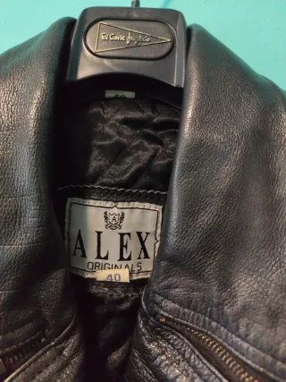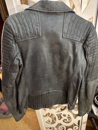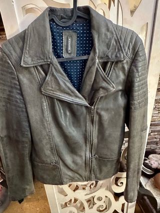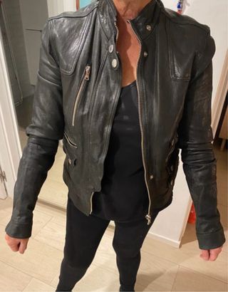 Cazadora de cuero de cabra con un estilo desgastado y moderno. Nunca usado por equivocación de talla. - Diseño tipo biker. - Cremallera frontal con botones. - Bolsillos con cremallera. - 100% Cuero de Cabra. - Forro interior 100% Algodón. - Incluye botones de repuesto.
