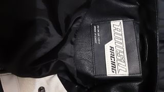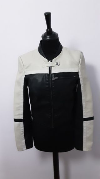 Cazadora estilo motero con un diseño bicolor. - Combinación de cuero negro y blanco. - Cuello redondo con cierre de botón. - Bolsillo con cremallera en el pecho.