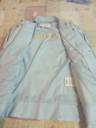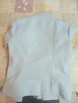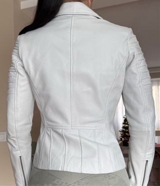 Preciosa cazadora de cuero ajustada de color blanco. Está nueva como se puede observar. Me la he puesto dos veces. Talla 8, talla S. Para referencia yo mido 170 y de pantalón uso la talla 36.