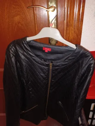 Cazadora de cuero sintético para mujer, con un diseño moderno y elegante. Es de Springfield de la talla 38 - Cuello redondo. - Cierre de cremallera. - Bolsillos frontales con cremallera.