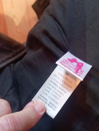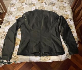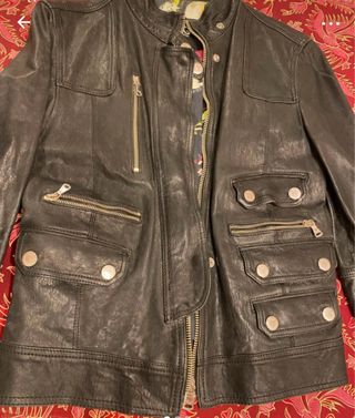 Cazadora de cuero con un diseño moderno y detalles únicos. Cuero de oveja 100% y algodón. Pone talla M pero es pequeña por eso pongo L - Cuello alto acanalado. - Dos bolsillos delanteros con solapa y remaches. - Puños y bajo acanalados.