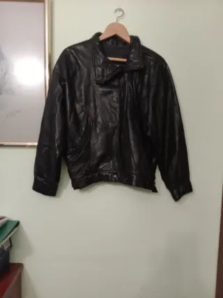 Cazadora de cuero negra con un diseño clásico. Forro en perfecto estado , nada roto , descosido o roces . Pone talla M pero da más talla - Cierre de cremallera frontal. - Bolsillos con cremallera. - Solapas con botones a presión. - Cinturón ajustable en la parte inferior.