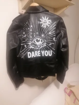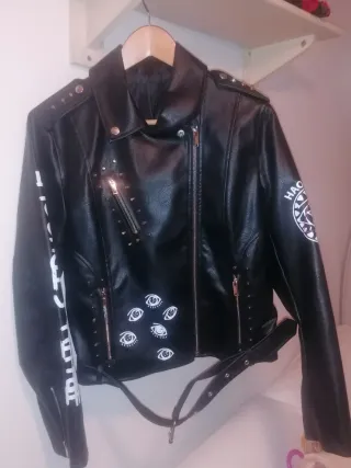 Cazadora cuero sintético,estilo motero con llamativo diseño de graffiti. Da talla el maniquí es 38. Medidas Hombros 45. Sisa 48 Largo 65
