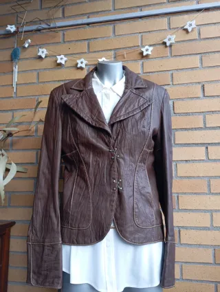 Elegante cazadora de cuero natural. - Cierre con ganchos metálicos. - Costuras decorativas. - Diseño entallado.
