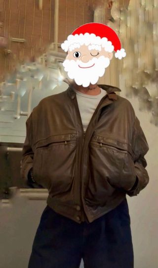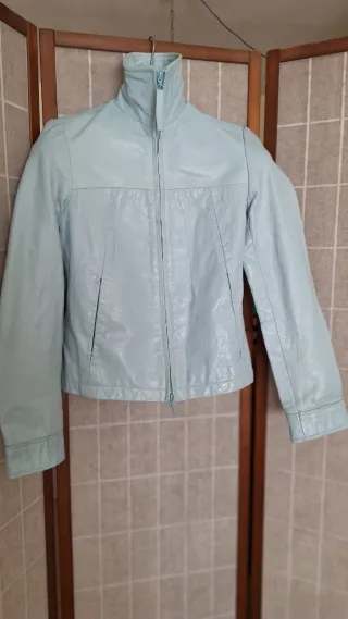 Cazadora de cuero con un diseño moderno y detalles únicos. Cuero de oveja 100% y algodón. Pone talla M pero es pequeña por eso pongo L - Cuello alto acanalado. - Dos bolsillos delanteros con solapa y remaches. - Puños y bajo acanalados.
