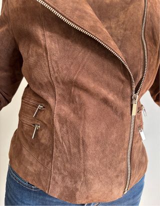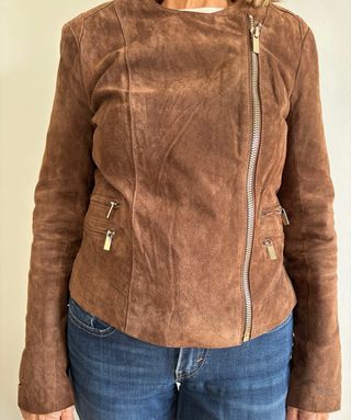 Cazadora de cuero de ante marrón marca Mango talla XS, usada en 2 ocasiones en perfecto estado tal y como se aprecia en las fotos, muy cómoda, no pesa, con cremalleras en los puños y en bolsillos. Color de temporada primavera muy bonita.