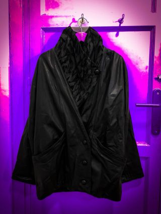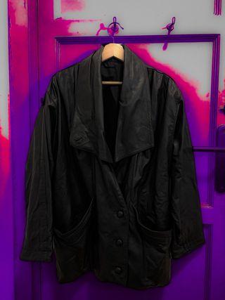 Clásica cazadora de cuero negro, estilo oversize de los años 80/90. Destaca su cuello convertible y forro interior estampado. El cuero es suave y tiene un corte holgado elegante. Perfecta para un look grunge chic o minimalista.