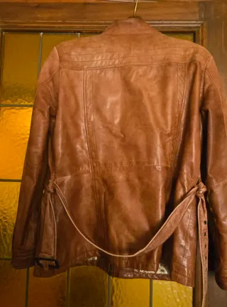 Cazadora de cuero estilo motero en tono marrón oscuro. Presenta un diseño clásico con cremallera asimétrica y cinturón. Talla 38, pero yo diría que es mas una S que una M. - Material: Cuero 100% Ovino - Color: Marrón - Cierre: Cremallera doble, permite abrir y cerrar por arriba y por abajo - Detalles: Cinturón ajustable en la cintura, solapas, bolsillos con cremallera. ¡¡Entra en mi perfil para descubrir más ofertas!!