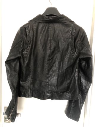 Chaqueta de cuero sintético en color negro. Está en muy buen estado. - Es de cuero sintético. - Talla S. -(Desgaste en la parte del cuello ppr estar colgada del perchero).