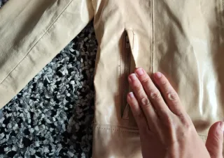 Cazadora de cuero auténtico en color beige. - Cuello redondo. - Cierre de cremallera. - Bolsillos frontales. - Muy buen estado, con algún signo de uso ( ver últimas fotos).