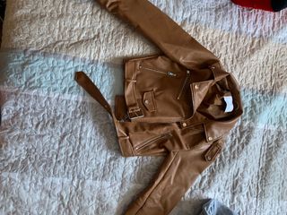 Preciosa cazadora de cuero sintético marrón de Stradivarius, talla S. Es una prenda elegante y cómoda, ideal para cualquier ocasión. - Diseño de chaqueta motera. - Cierre de cremallera. - Bolsillos con cremallera. - Detalles con hebillas.