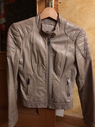 Cazadora de cuero de Massimo Dutti, talla XL. Se ha puesto un solo día, por lo que está nueva. La vendo porque me queda demasiado justa. La ofrezco exactamente por el 30% de lo que me costó.