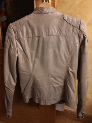Preciosa cazadora de cuero de Massimo Dutti. Es de color beige y tiene un diseño elegante y atemporal. Es una cazadora de más de 250€,hombros 45cm,axilas 46cm y largo 57cm - Talla: (Añadir talla) - Cierre de cremallera - Bolsillos funcionales - Puños de canalé