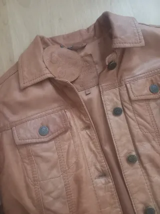 Chaqueta de cuero , estilo vaquero . Cinco bolsillos . Botones