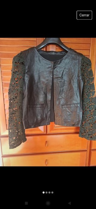 Chaqueta de cuero con mangas y espalda de guipur, como nueva, usada un par de veces, XS.