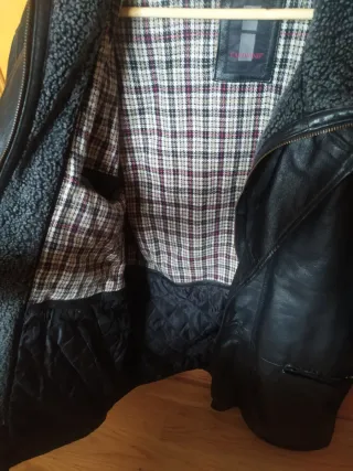 Cazadora de cuero auténtico, negra con un diseño clásico y elegante. Perfecta para cualquier ocasión. Calentita y en perfecto estado. - Material exterior: cuero genuino. - Forro interior a cuadros. - Cuello con acabado de borreguito. - Cierre de cremallera frontal.