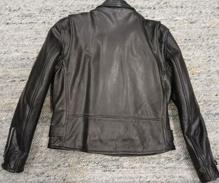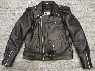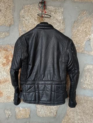 Chaqueta de cuero negra, estilo motero y antigua. Con protecciones en hombros y codos.