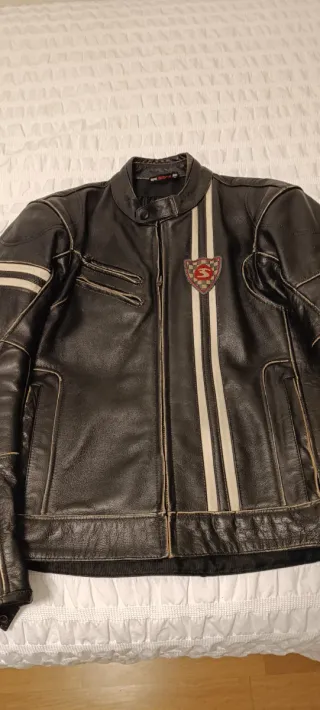 Cazadora moto no lleva protecciones,chaleco térmico desmontable color marrón envejecido vendo por no usar me queda grande, tallaL, grosor 1,2mm muy buena está perfecta no hago envíos.