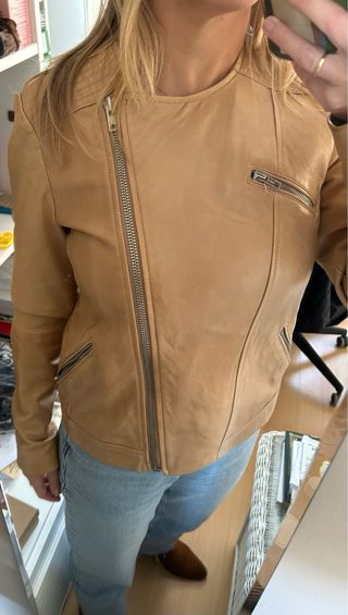 cazadora de cuero color tabaco sin cuello y con apenas uso.