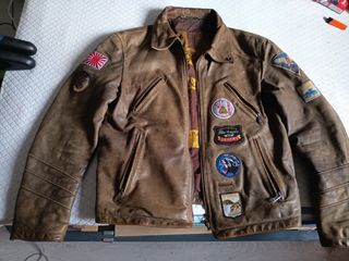 Chaqueta de cuero marrón con múltiples parches. Es una prenda usada, con señales de uso visibles pero en buen estado general. - Estilo vintage. - Cierre con cremallera. - Bolsillos funcionales. - Detalle de hebillas en la espalda.