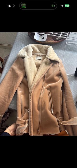 Cazadora de ante con forro interior de borreguito. - Cuello amplio de borreguito. - Puños y bajo con acabado de borreguito. - Bolsillos delanteros. - Cierre de cremallera. -Talla S/M -sin estrenar