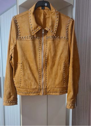 Cazadora similar al ante o antelina. Talla 42 amplia. Color camel o marrón claro. Forrada. Con tachuelas. Bolsillos laterales. Manga con puño de clip. Cremallera plateada. Medidas aprox. de sisa 56 cm. de largo 53 cm desde el hombro Totalmente nueva. Nunca usada.