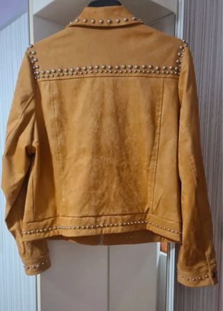 Cazadora de ante en color rosa palo con tachuelas. Utilizada muy pocas veces, está en buen estado. Muy funcional, moderna y conjuntable. Uno de los agujeros ha perdido la tachuela (subo foto) y las puntas del cuello están un pelín rozadas (también subo foto).