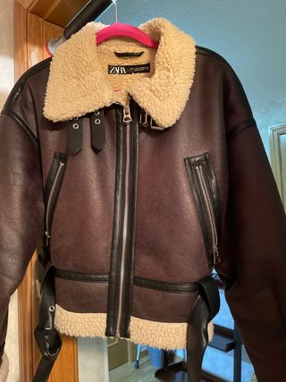 Cazadora estilo aviador de Zara con forro de borreguito. - Cierre de cremallera frontal. - Cuello con solapas y cintas. - Bolsillos con cremallera en el pecho. - Cinturón ajustable en la cintura.