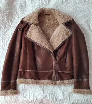 Cazadora de estilo aviador con exterior efecto piel y forro interior de borrego. Usada dos veces. Esta nueva - Cierre de cremallera. - Cuello con solapas. - Puños y bajo con detalle de borrego.