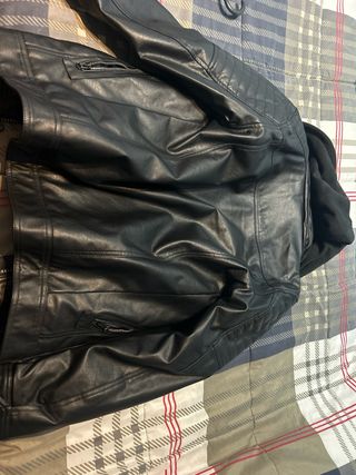 Cazadora de estilo motero con acabado en imitación de cuero. Presenta un diseño moderno y versátil. - Cierre de cremallera frontal. - Bolsillos con cremallera. - Cuello redondo. - Detalle acolchado en hombros.