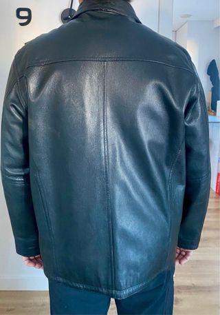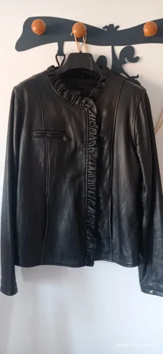 Comprada en Bata. Piel auténtica. Dos bolsillos ocultos y uno pequeño superior delantero. Cierra con cremallera. Tiene un pequeño volante decorativo. En excelente estado. Está usada, obviamente, pero no tiene roces ni desgastes. Adjunto fotos de detalle. Queda un poco entallada y a mí ya no me entra. Talla L. Ancho entre hombros 42 cm, largo total 59 cm, contorno pecho (cerrada) 98-100 cm. Es una talla 48 italiana (t. 40-42 española).