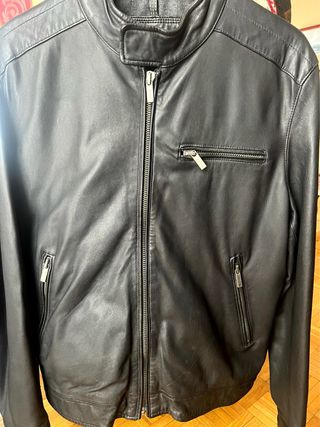 Cazadora de cuero negro hombre talla 54, tiene alguna rozadura, la q se nota más está en el lado derecho cerca del bolsillo, se ve en una de las fotos, comprada en una tienda q se dedicaban solo a artículos en piel