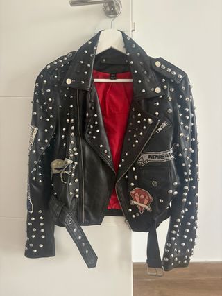 Cazadora de piel negra con tachas plateadas y forro rojo. Un diseño llamativo y con estilo. - Detalle de tachas por toda la prenda. - Cierre de cremallera frontal. - Cinturón ajustable en la cintura. - Parches decorativos en la manga y el pecho.